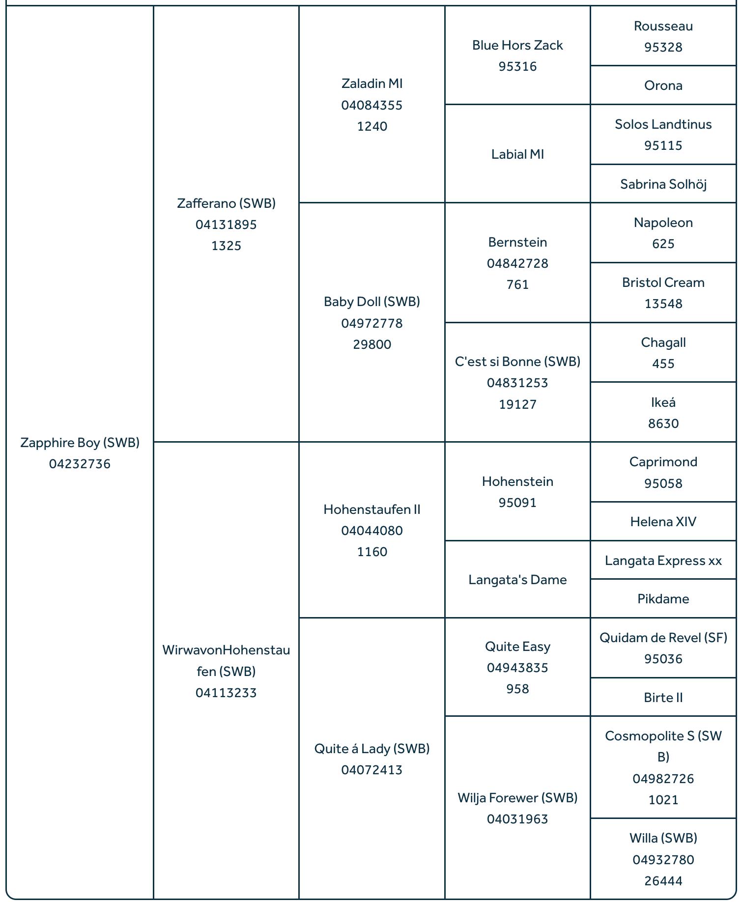 Zapphire is a breeding stallion with elite bloodlines, beautiful conformation, and great temperament. His sire (Zafferano) is a unique stallion that is currently competing Grand Prix dressage and was the most used warmblood Palomino stallion in Europe 2024. Other notable relatives include Quite Easy, a showjumping stallion that placed 4th in the 2002 Olympic Games. His Grand Sire Hohenstaufen II' was a succesful Grand Prix dressage horse, however his lineage does also encompass significant showjumping bloodlines. His dam, Langata's Dame, produced offspring successful in showjumping, such as Ramila, who competed at the 1.60m level . Additionally, his granddam, Pikdame, is the full sister to Pik Bube's Girl, Germany's best mare of 1990 . Pikdame also produced Ramiro's Son I and II, both of whom had significant showjumping careers.
